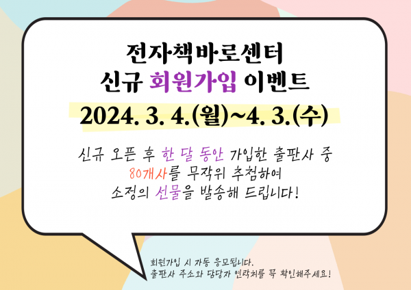 [홍보] 전자책바로센터 신규 회원가입 이벤트 (2024. 3. 4.~4. 3.)