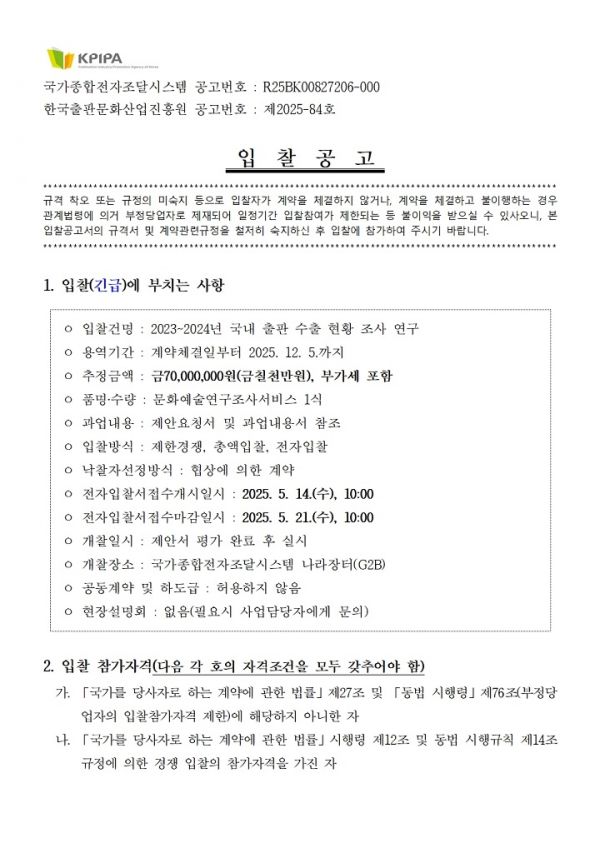 - 다음글<출판콘텐츠 기술개발 과제 발굴 연구> 입찰공고(긴급) 25.04.18